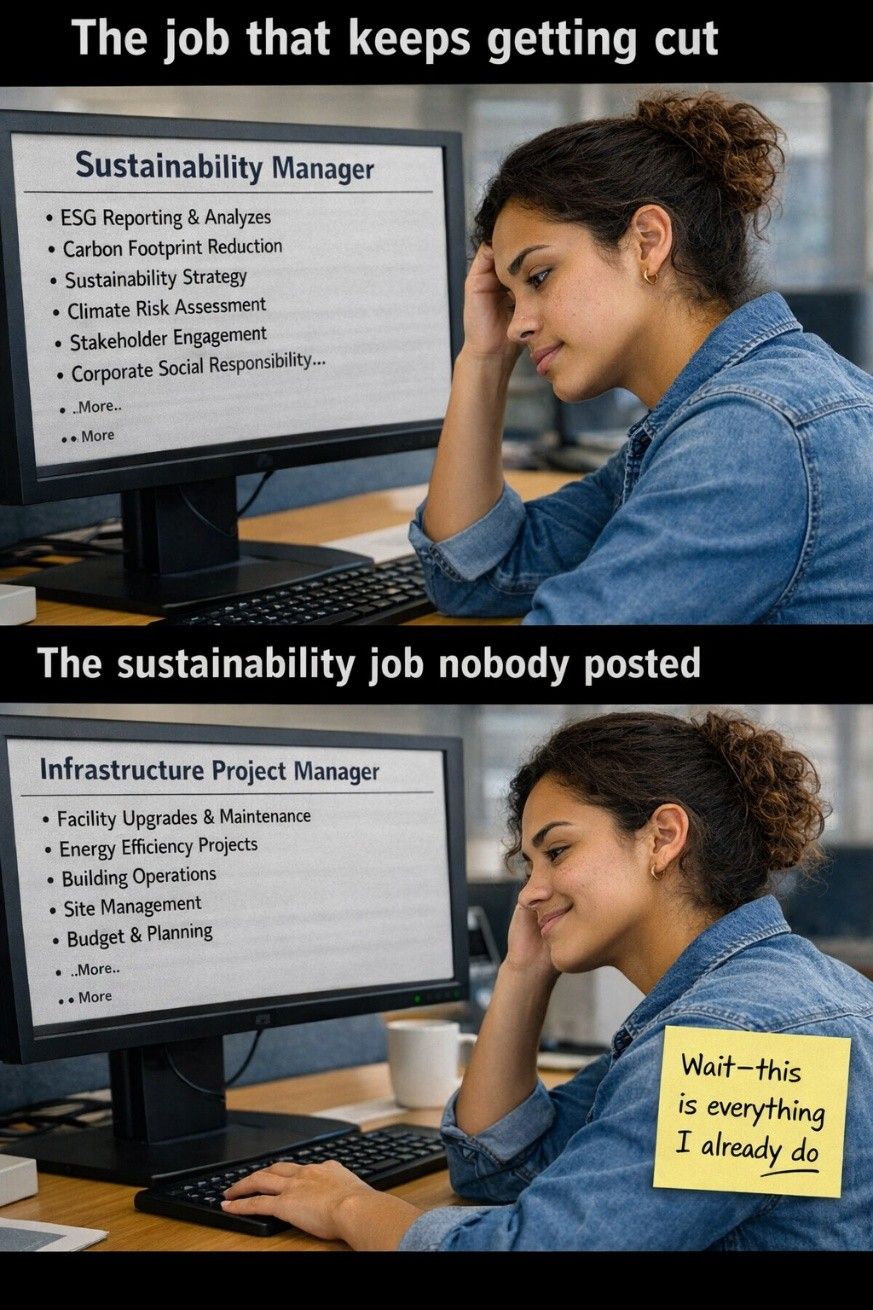 ESG department jobs are contracting. Green-skilled workers are getting hired faster than almost anyone else. The difference is whether your skills connect to real decisions and measurable outcomes or just to reports. If you work in buildings, you almost certainly have the former. The job you want may already exist. It just may not be posted under the name you expect.